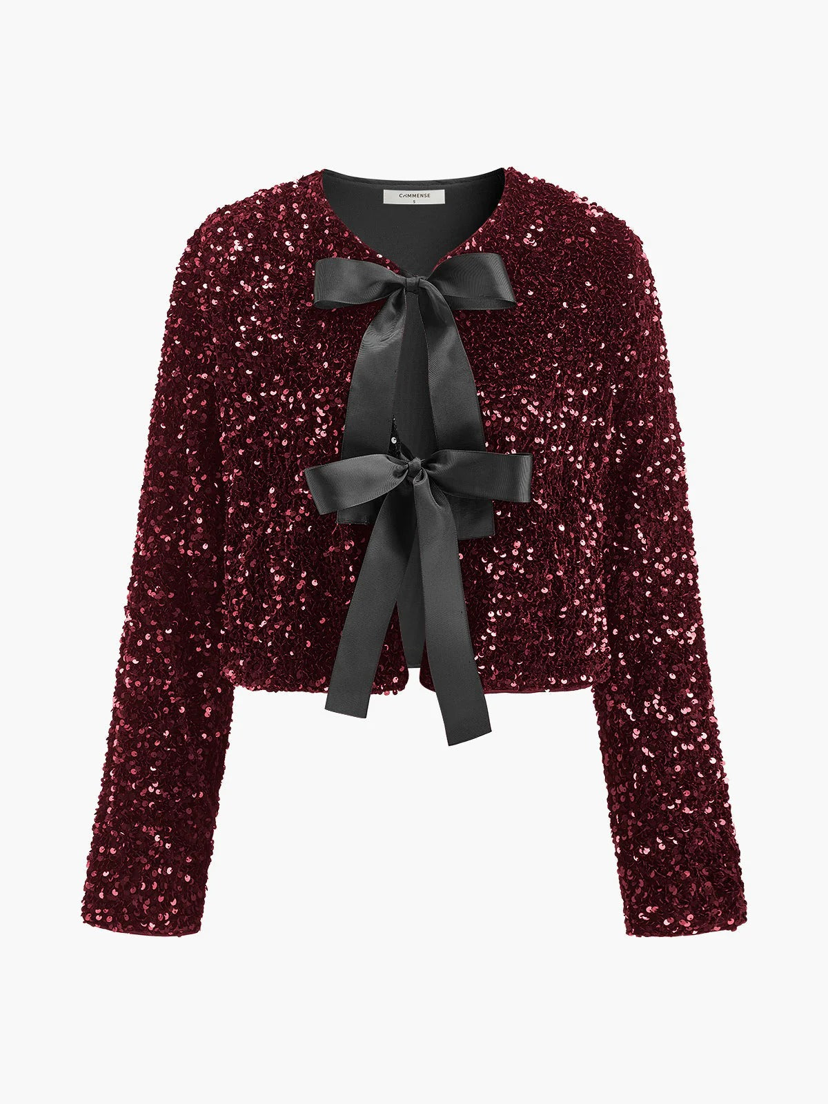 Dazzling, refined, and crafted for special moments — the Women’s Elara Sequin Bow-Front Cropped Jacket brings glamorous sophistication to evening dressing. Covered in shimmering sequins and finished with elegant satin-style bow ties, it strikes a perfect balance between statement sparkle and timeless femininity. Ideal for pairing with tailored trousers, sleek skirts, or occasion dresses for celebrations and refined nights out.