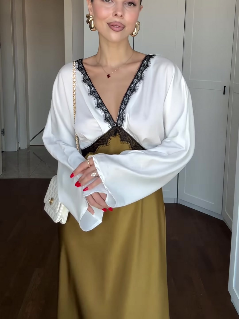 Elegant lace-trimmed neckline adds a touch of refined romance