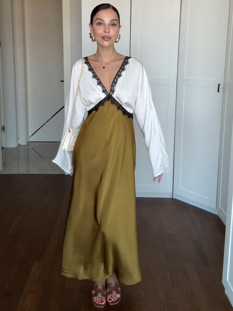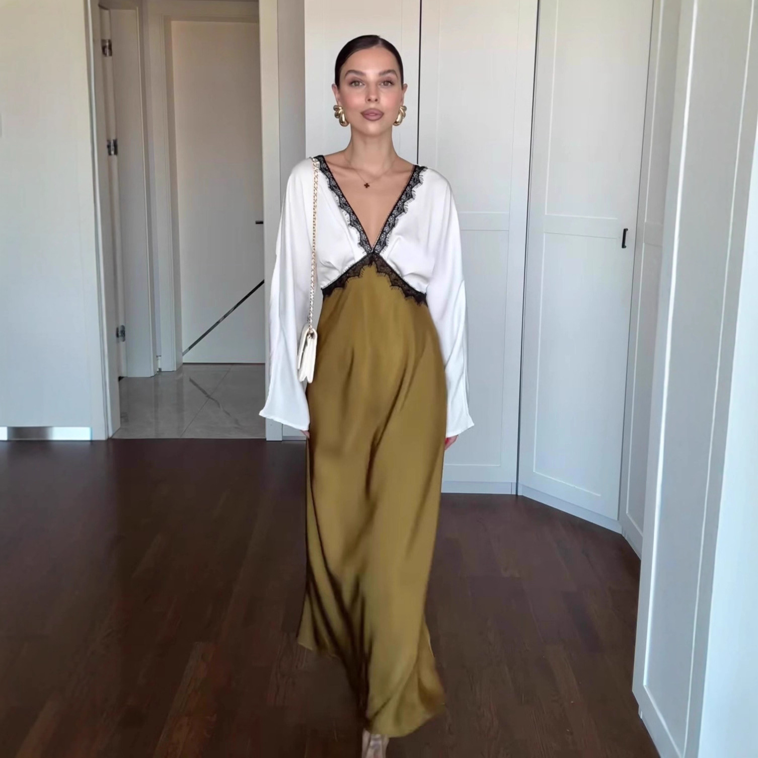 An ode to evening allure, the Women’s Celeste Lace-Trim Satin Midi Dress embodies sophistication with a sultry edge. Crafted with a lustrous satin finish and framed by delicate lace detailing, this dress contours the body with timeless elegance. The deep neckline, cinched waist, and fluid skirt create a refined silhouette that moves effortlessly from candlelit dinners to formal soirées.