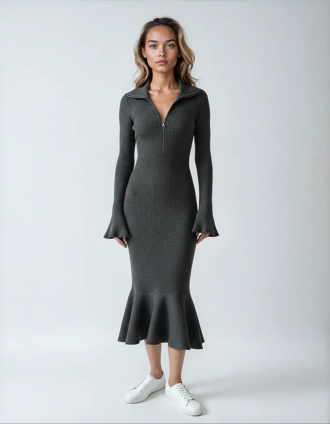 Elevate your wardrobe with a statement piece designed to flatter every curve. This woman’s long-sleeve knit dress features a sculpting silhouette with a soft, body-hugging ribbed texture that enhances movement and comfort. The dramatic flared hem adds fluid elegance, while the zip-front neckline offers versatile styling — from a refined high collar to a bold, open V-shape. With its fluted sleeves and sophisticated finish, it’s perfect for evenings out, special occasions, or chic day-to-night wear.