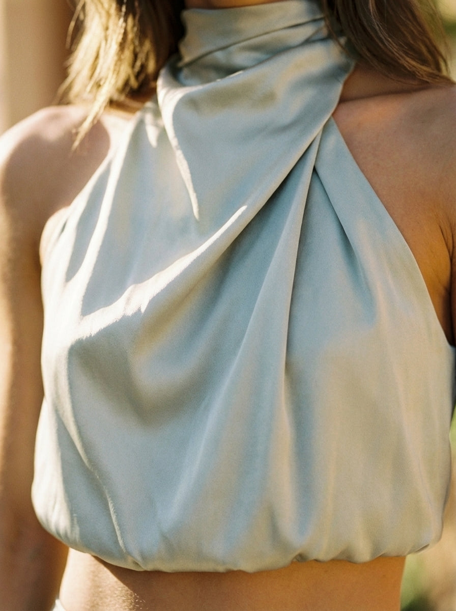 • Cropped halter top with a gently draped cowl neckline that softens the shoulder line