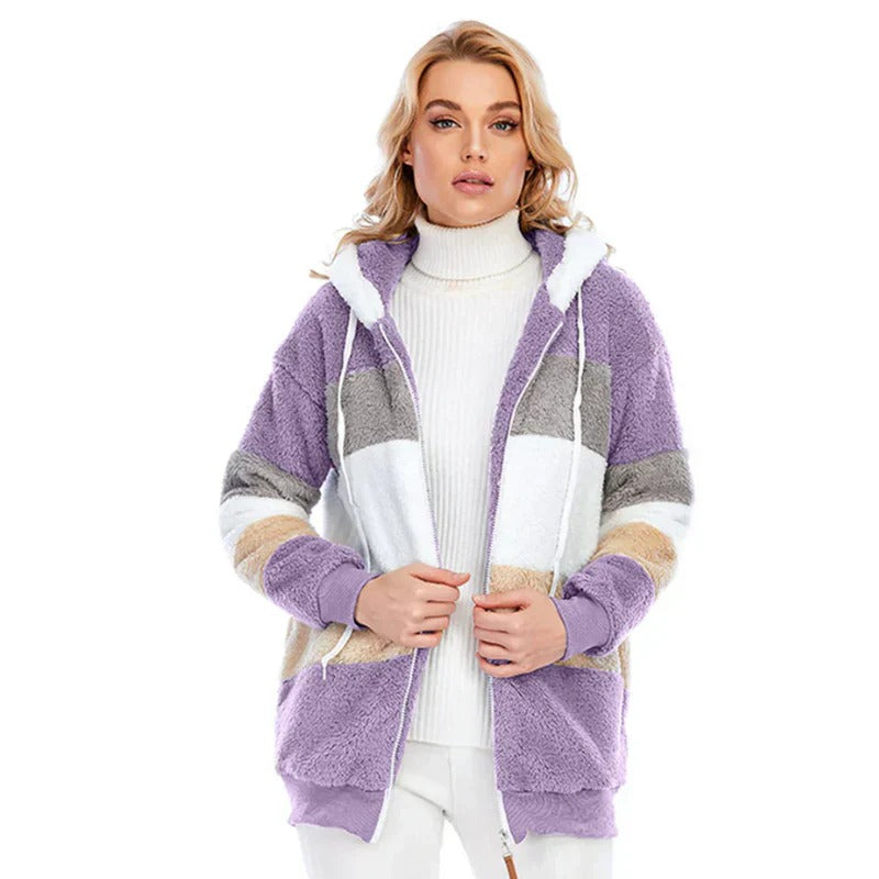 A cosy colour-block hoodie designed for warmth and everyday comfort. Crafted from soft sherpa fleece, it offers a plush feel while keeping you shielded from cold winter days. The zip-up front adds practicality, making it easy to layer over your favourite tops, while the relaxed fit ensures effortless wear throughout the season. Ideal for staying warm on casual outings, lounging at home, or layering for winter walks.