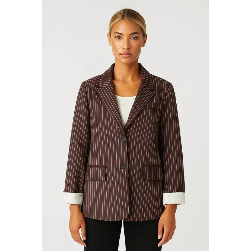A refined pinstripe blazer designed for a polished, effortlessly modern look. The structured tailoring creates a flattering silhouette, while the crisp vertical stripes add a touch of sophistication suitable for work, meetings, or elevated everyday wear. The turned-up contrast cuffs introduce a subtle contemporary twist, making this blazer versatile enough to style with trousers, denim, or skirts. Its single-breasted closure and sharp lapel finish give it a timeless, clean-lined appeal that feels both classic and current.