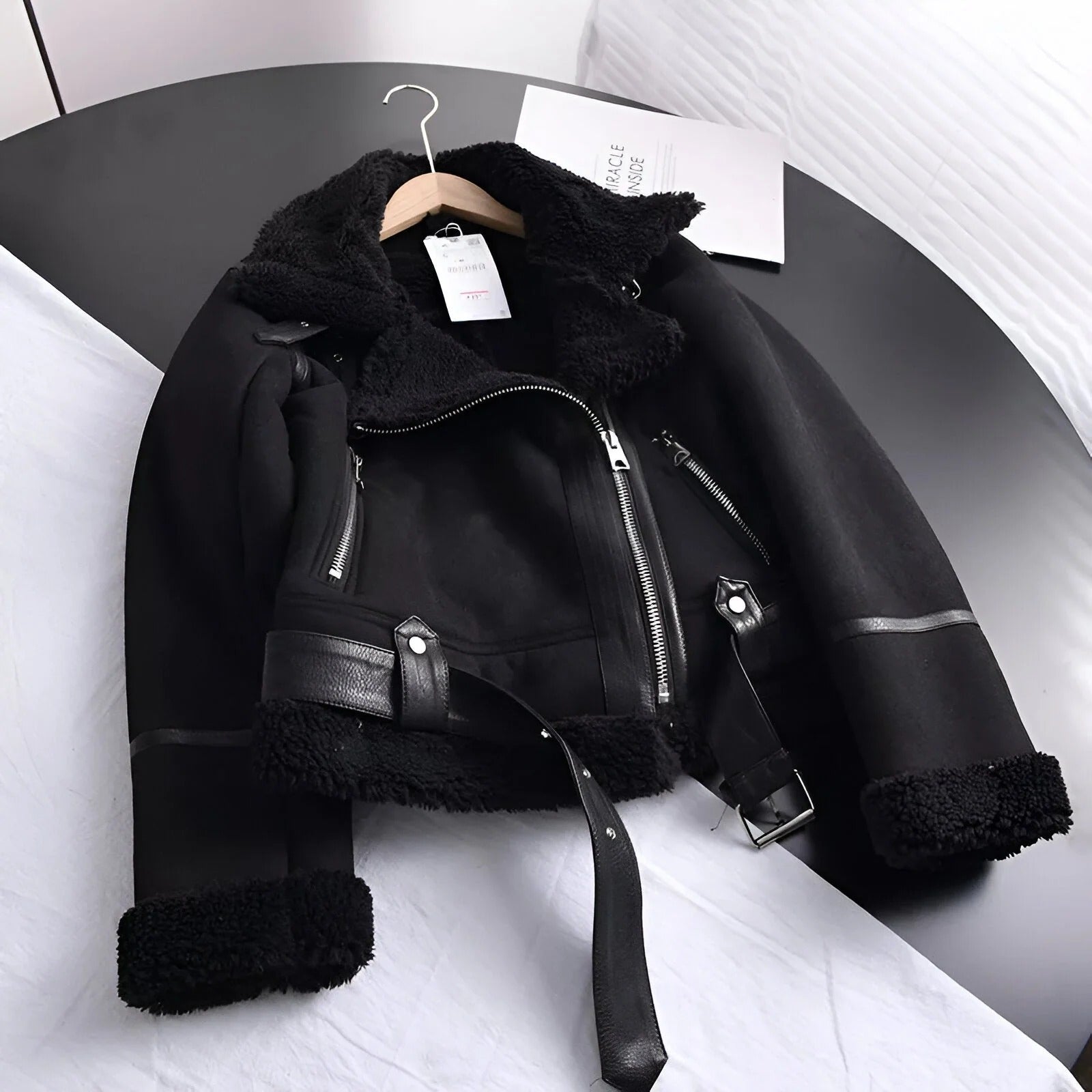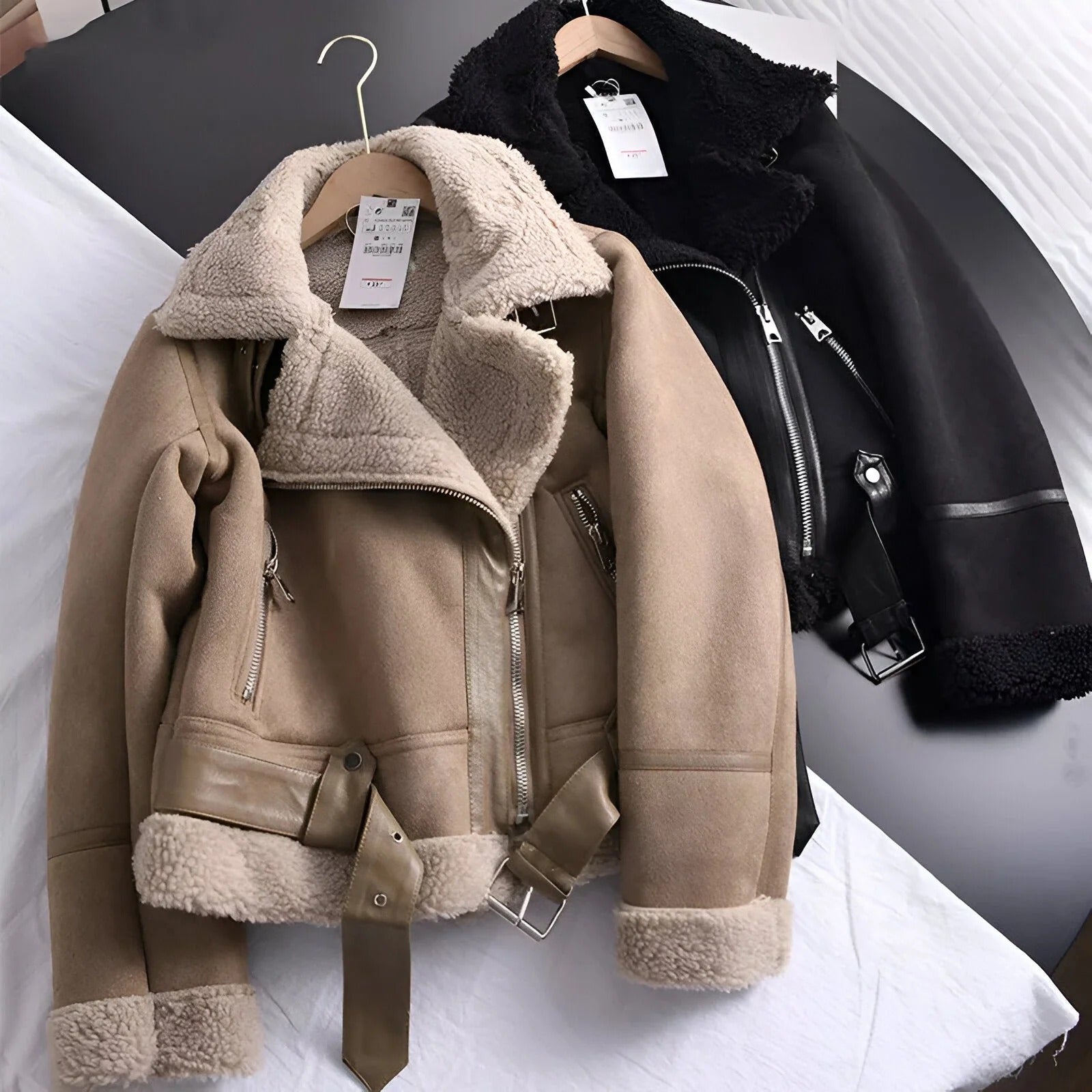 A cosy aviator-style jacket designed with a plush shearling lining for warmth and comfort. The structured outer, exposed zippers, and belted hem add a stylish, modern edge, while the wide lapel collar enhances the classic aviator look. Perfect for everyday wear through chilly seasons, offering both practicality and effortless style.